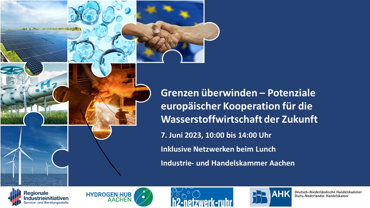 die Service- und Beratungsstelle für regionale Industrieinitiativen, der Hydrogen Hub Aachen, das h2-netzwerk-ruhr und die Deutsch-Niederländische Handelskammer laden am Mittwoch, den 7. Juni 2023 zur Veranstaltung „Grenzen überwinden – Potenziale europäischer Kooperation für die Wasserstoffwirtschaft der Zukunft“ ein. Im Anschluss an das Programm haben Sie ab 12:45 Uhr bei einem gemeinsamen Mittagessen die Möglichkeit, sich weiter zu vernetzen.