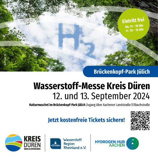 am 12. und 13. September 2024 veranstaltet der Kreis Düren in Zusammenarbeit mit dem Wasserstoffnetzwerk HyCologne und dem Hydrogen Hub Aachen die 4. Wasserstoff-Messe Kreis Düren. Eine Vielzahl an Ausstellerinnen und Aussteller, die sich von der Forschung bis zur Anwendung mit dem Thema Wasserstoff auseinandersetzen, freuen sich darauf, mit Ihnen in Kontakt zu kommen und sich über neue Entwicklungen auszutauschen.